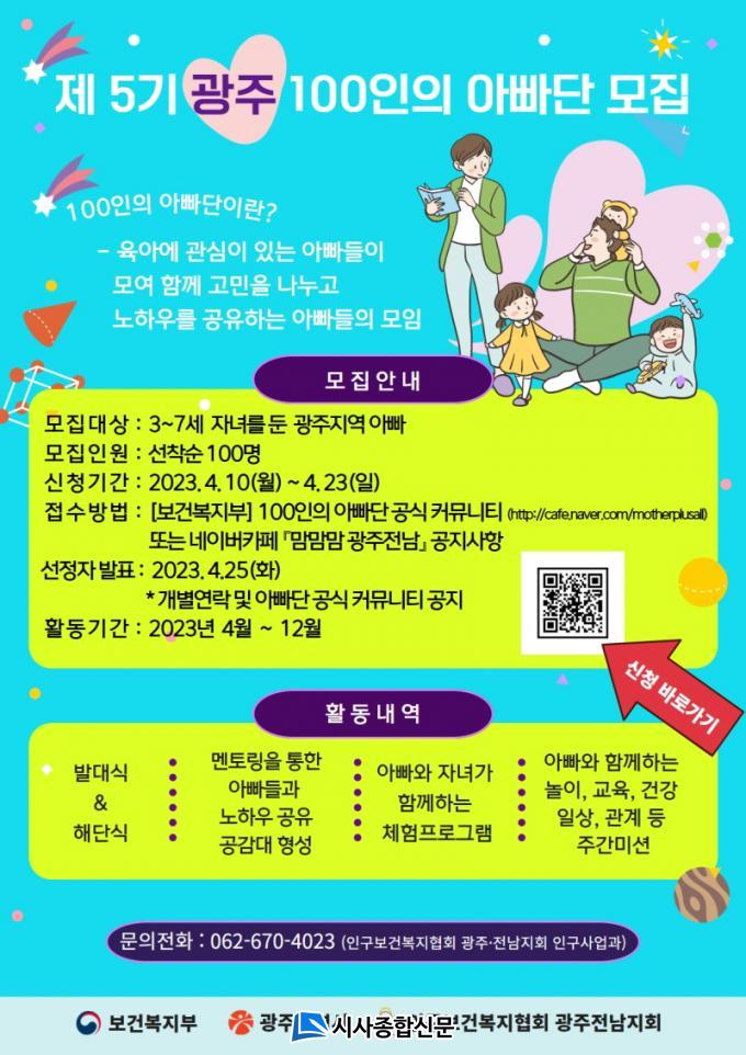 ¡®100ÀÎÀÇ ¾Æºü´Ü¡¯Àº º¸°Çº¹ÁöºÎ¿Í ±¤ÁÖ½Ã, Àα¸º¸°Çº¹ÁöÇùȸ ±¤ÁÖÁöȸ°¡ ÇÔ²² À°¾Æ¿¡ ¼Å÷ Ãʺ¸ ¾Æºüµé¿¡°Ô ´Ù¾çÇÑ À°¾Æ Á¤º¸¸¦ Á¦°øÇϰí üÇèȰµ¿ µîÀ» ÅëÇØ À°¾Æ¿¡ ´ëÇÑ °í¹Î°ú ºñ¹ýÀ» °øÀ¯ÇÏ´Â ¸ðÀÓÀÌ´Ù. 2019³â ù Ȱµ¿À» ½ÃÀÛÇØ ¿ÃÇØ 5±â¸¦ ¸Â¾Ò´Ù.