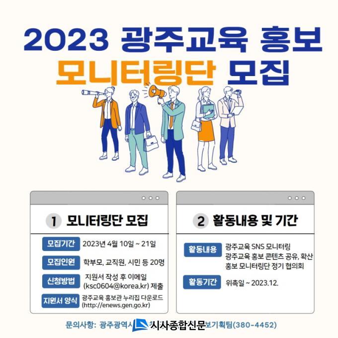 11ÀÏ ±¤Áֽñ³À°Ã»¿¡ µû¸£¸é ¡®±¤ÁÖ±³À° È«º¸ ¸ð´ÏÅ͸µ´Ü(ÀÌÇÏ ¸ð´ÏÅ͸µ´Ü)¡¯Àº ÃÑ 20¸íÀ¸·Î ±¸¼ºµÆÀ¸¸ç À§ÃË ÈÄ ¿ÃÇØ ¸»±îÁö Ȱµ¿ÇÏ°Ô µÈ´Ù. ƯÈ÷, ±¤Áֽñ³À°Ã»ÀÇ SNS ä³Î, È«º¸ ÄÜÅÙÃ÷ µîÀ» Çкθ𡤽ùÎÀÇ ´«À¸·Î ¸ð´ÏÅ͸µÇϰí ÇöÀåÀÇ ¹ÝÀÀ°ú ÀǰßÀ» ¼ö½Ã·Î Àü´ÞÇÑ´Ù. ¶Ç Á¤±â ÇùÀÇȸ¸¦ ÅëÇØ ´Ù¾çÇÑ °³¼± ÀǰßÀ» °øÀ¯ÇÒ °èȹÀÌ´Ù.