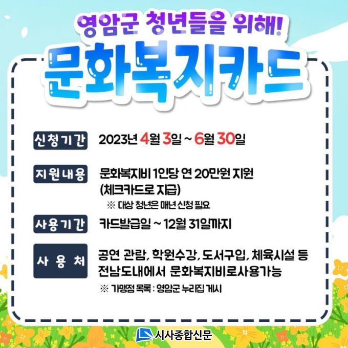 û³â ¹®Èº¹ÁöÄ«µå Áö¿ø»ç¾÷Àº °ø¿¬°ü¶÷, Çпø¼ö°, µµ¼±¸ÀÔ µî¿¡ »ç¿ëÇÒ ¼ö ÀÖ´Â ¹®Èº¹Áöºñ¸¦ 1ÀÎ´ç ¿¬ 20¸¸¿ø Áö¿øÇÏ´Â »ç¾÷À¸·Î, Áö¿ø´ë»óÀº 2021³â 4¿ù 3ÀÏ ÀÌÀüºÎÅÍ °è¼ÓÇØ¼ Àü¶ó³²µµ ³»¿¡ ÁÖ¼Ò¸¦ µÎ°í ½ÅûÀÏ ±âÁØ ¿µ¾Ï±º¿¡ ÁÖ¼Ò°¡ ÀÖ´Â 19¼¼ ÀÌ»ó 28¼¼ ÀÌÇÏ(1995³â~2004³â»ý) û³âÀÌ´Ù.