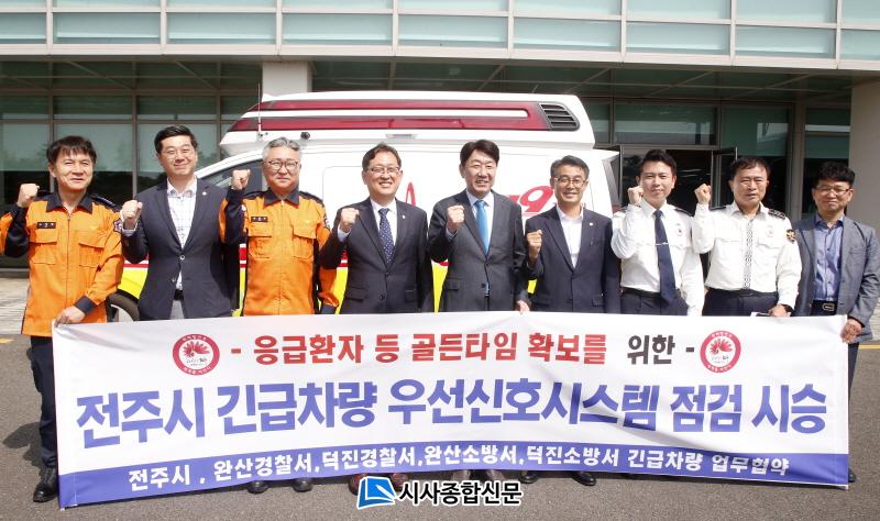 ÀüÁֽô 19ÀÏ ÀüÁÖ¿ùµåÄŰæ±âÀåºÎÅÍ ÀüºÏ´ëÇб³º´¿ø ÀÀ±Þ½Ç±îÁö 9.2km ±¸°£¿¡¼ ¿ì¹ü±â ÀüÁÖ½ÃÀå°ú À⵿̱ ÀüÁÖ½ÃÀÇȸ ÀÇÀå, ¿Ï»ê¡¤´öÁø°æÂû¼Àå, ¿Ï»ê¡¤´öÁø¼Ò¹æ¼Àå µîÀÌ Âü¼®ÇÑ °¡¿îµ¥ ¡®±ä±ÞÂ÷·® ¿ì¼±½ÅÈ£½Ã½ºÅÛ Á¡°Ë ½Ã½Â½Ä¡¯À» °¡Á³´Ù.
