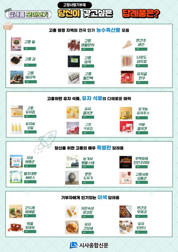 °íÈﱺÀº °íÇâ»ç¶û±âºÎÁ¦ ´ä·ÊǰÀ¸·Î ÇÑ¿ì, À¯ÀÚ, ¼®·ù, »ý¼±, ½Ò µî ûÁ¤³ó¼öÃà»êǰ 400¿© Á¾°ú °íÈï»ç¶û»óǰ±Ç, ºÐû»ç±â, ´É°¡»çÅÛÇýºÅ×ÀÌ, ¹úÃÊ´ëÇ༺ñ½º, ÁÖÅÃÈÀç¾ÈÀü²Ù·¯¹Ì¸¦ Á¦°øÇϰí ÀÖ´Ù.