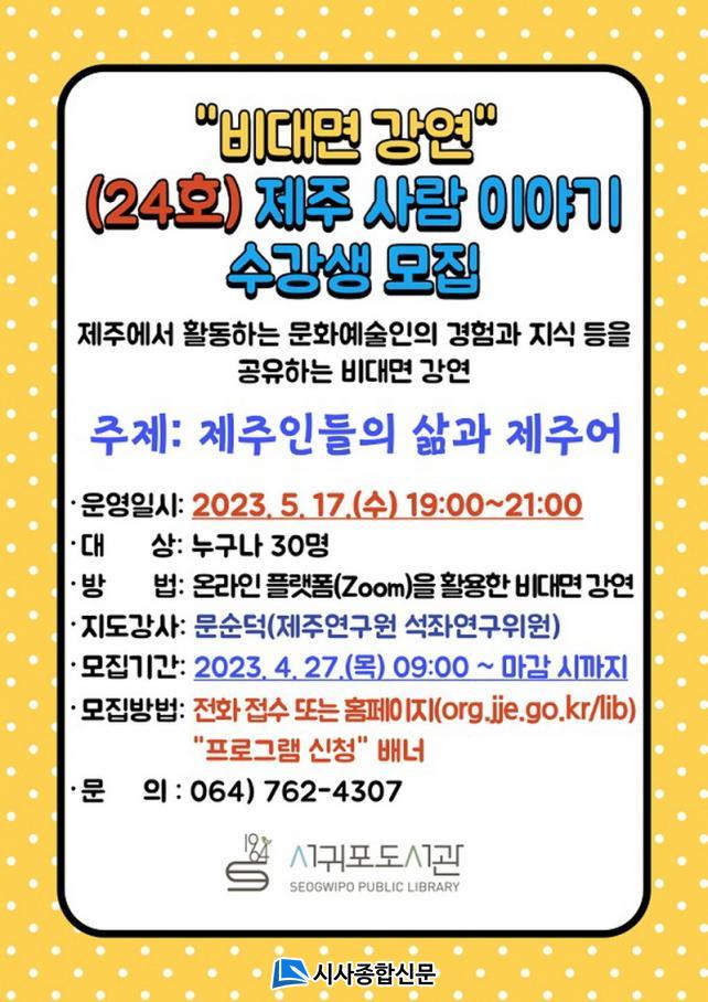 ºñ´ë¸é ¿Â¶óÀÎ(Zoom) ¹æ½ÄÀ¸·Î ÁøÇàµÇ´Â À̹ø °¿¬Àº ¹®¼ø´ö(Á¦ÁÖ¿¬±¸¿ø ¼®Á¿¬±¸À§¿ø) °»ç¸¦ ¸ð½Ã°í¡®Á¦ÁÖÀεéÀÇ »î°ú Á¦Á־¶ó´Â ÁÖÁ¦·Î ¿À´Â 5¿ù 17ÀÏ(¼ö) ¿ÀÈÄ 7~9½Ã¿¡ ¿î¿µµÈ´Ù.