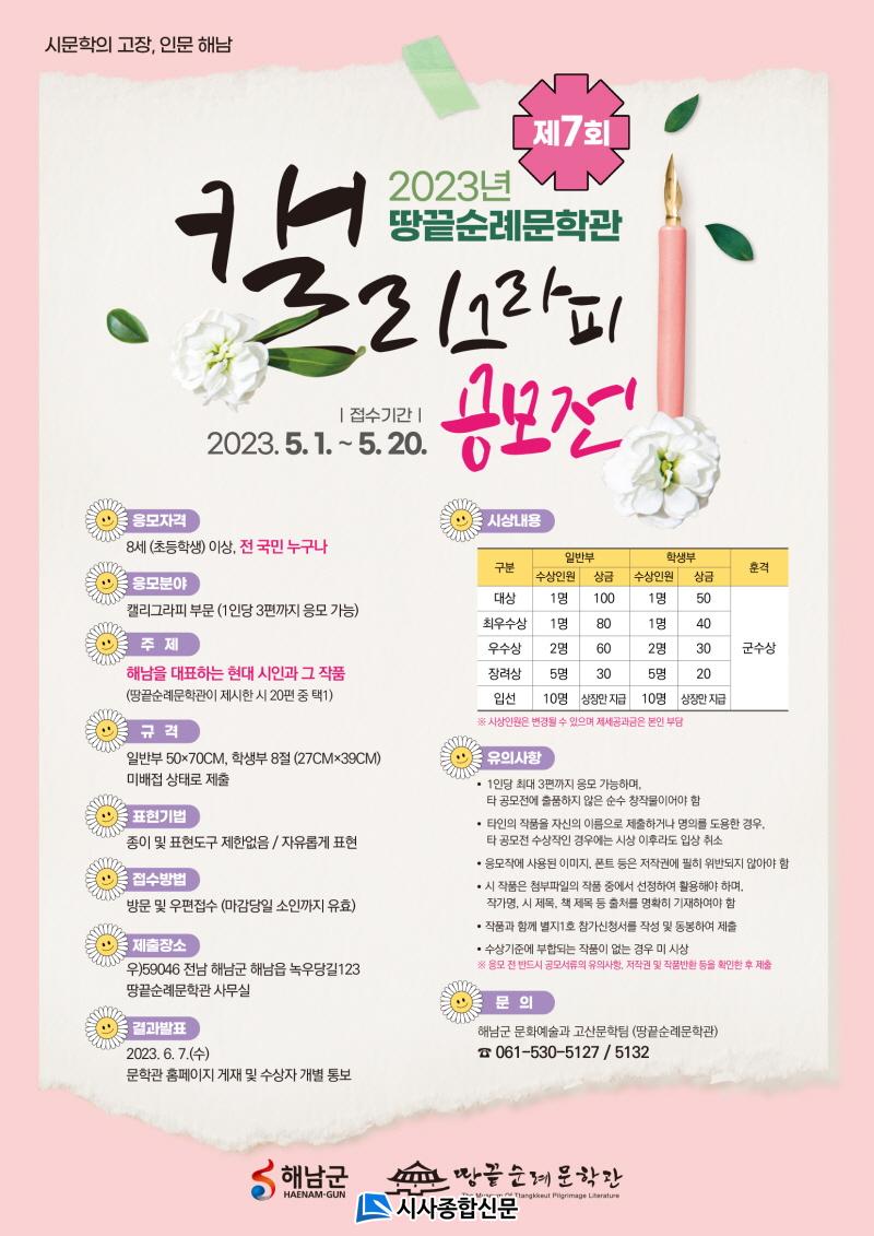 8¼¼(ÃʵîÇлý) ÀÌ»ó Àü ±¹¹Î ´©±¸³ª ÀÀ¸ðÇÒ ¼ö ÀÖÀ¸¸ç 1Àδç ÃÖ´ë 3Æí±îÁö Á¦ÃâÇÒ ¼ö ÀÖ´Ù. ÀÀ¸ð±â°£Àº ¿À´Â 5¿ù 1ÀϺÎÅÍ 20ÀϱîÁöÀ̸ç ÀÚ¼¼ÇÑ »çÇ×Àº ÇØ³²±ºÃ» ȤÀº ¶¥³¡¼ø·Ê¹®Çаü ´©¸®Áý¿¡¼ È®ÀÎÇÒ ¼ö ÀÖ´Ù. °ü·Ã ¹®ÀÇ´Â ¶¥³¡¼ø·Ê¹®Çаü(¢Ï061-530-5132)À¸·Î ÇÏ¸é µÈ´Ù.