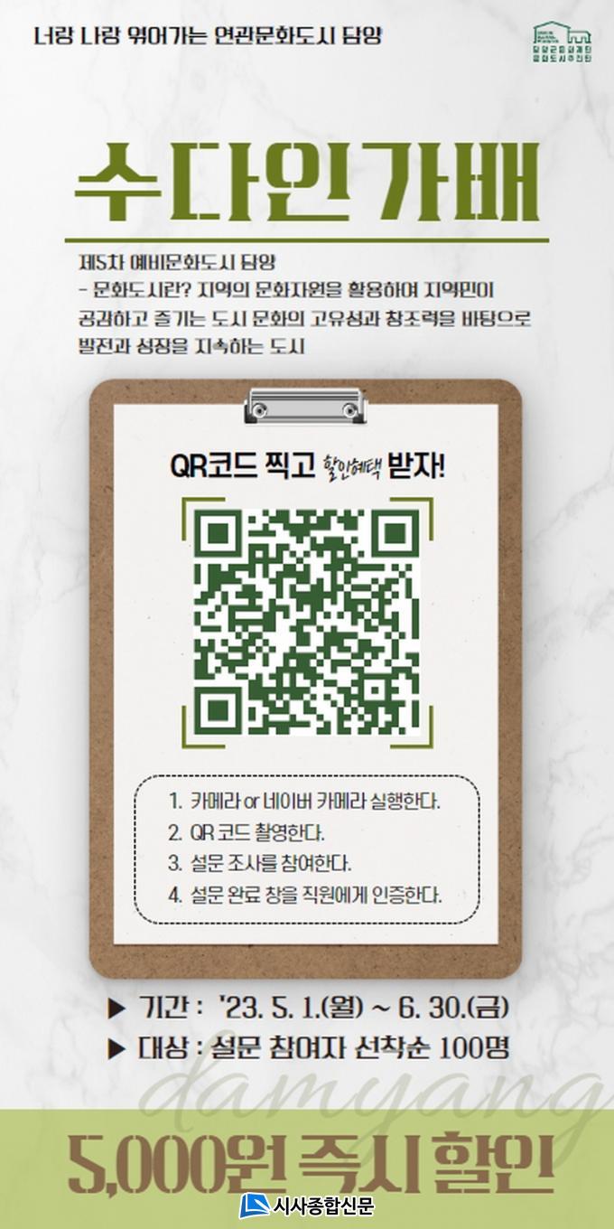 ¡®¼ö´ÙÀΰ¡¹è¡¯´Â ´ã¾ç±º ³» 12°÷ÀÇ Çù·Â Ä«Æä¸¦ °ÅÁ¡À¸·Î ÁøÇàµÇ¸ç, Ä«Æä¿¡ ¹æ¹®ÇÑ Áö¿ª¹Î°ú ¹æ¹®°´µéÀº QRÄڵ带 ÅëÇØ ¼³¹®¿¡ Âü¿©Çϰí, Âü¿© ÈÄ Ä«Æä Ãø¿¡ ¿Ï·á ÀÎÁõÀ» ¹ÞÀº ¼±Âø¼ø 1,200¸í¿¡°Ô´Â °¢ 5,000¿ø ÇÒÀÎ ÇýÅÃÀ» Á¦°øÇÑ´Ù.
