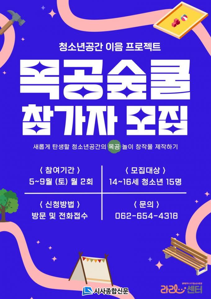 ±¤ÁÖ±¤¿ª½Ãû¼Ò³âȰµ¿ÁøÈï¼¾ÅÍ °ø¸ð»ç¾÷ÀΠû¼Ò³â°ø°£ ÀÌÀ½ ÇÁ·ÎÁ§Æ® ¡®¸ñ°ø½£Äð¡¯Àº ¸ñ°øÀ» Ȱ¿ëÇÏ¿© ³îÀÌ Ã¢ÀÛ¹°À» Á¦ÀÛÇÏ´Â ÇÁ·Î±×·¥À¸·Î Âü¿©ÇÑ Ã»¼Ò³âµé°ú ÇÔ²² »õ·Ó°Ô ź»ýÇÒ ¼ö·Ã°ü ³» û¼Ò³â°ø°£À» ÇÔ²² ±¸¼ºÇÒ °èȹÀÌ´Ù.
