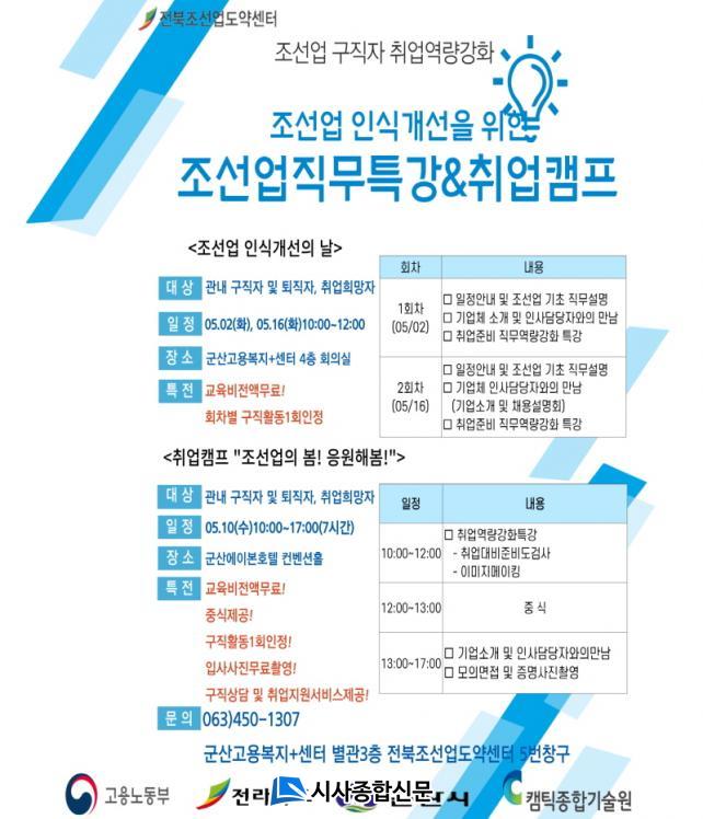 Á¶¼±¾÷ °ü·Ã ±â¾÷ Àλç´ã´çÀÚÀÇ Ã¤¿ëÀοø, Á÷¹«¼³¸í, ÁúÀÇÀÀ´ä ¹× ¸éÁ¢±³À°À¸·Î ±¸Á÷ÀÚµéÀÇ Á¶¼±¾÷ Á÷Á¾¿¡ ´ëÇÑ ÀνÄÀ» °³¼±Çϱâ À§ÇÔÀÌ´Ù. »çÀü Âü¿©½Åû Á¢¼ö´Â ¿À´Â 15ÀϱîÁö´Ù. ´õºÒ¾î ±¸Á÷ÀÚÀÇ Ãë¾÷¿ª·® °È¸¦ À§ÇÑ Á¶¼±¾÷ Ãë¾÷Ä·ÇÁ ¡®Á¶¼±¾÷ÀÇ º½!ÀÀ¿øÇØ º½!¡¯ÀÌ ¿À´Â 10ÀÏ ¼ö¿äÀÏ 10:00½ÃºÎÅÍ ±º»ê ¿¡À̺»È£ÅÚ¿¡¼ °³ÃֵȴÙ. ¿ëÁ¢ ¹× µµÀå Á÷¾÷ÈÆ·Ã ±³À°¾È³», Á¶¼±¾÷ °ü·Ã ±â¾÷ Àλç´ã´çÀÚÀÇ Á÷¹«¼³¸í ¹× ÀÔ»çÁö¿ø¼ ÀÛ¼º µî ±¸Á÷ÀÚµéÀÇ Á¶¼±¾÷ ¸ÂÃãÇü Ãë¾÷Áö¿øÀ» À§ÇÑ ÇÁ·Î±×·¥ÀÌ´Ù. »çÀüÁ¢¼ö´Â ¿À´Â 8ÀϱîÁö´Ù.