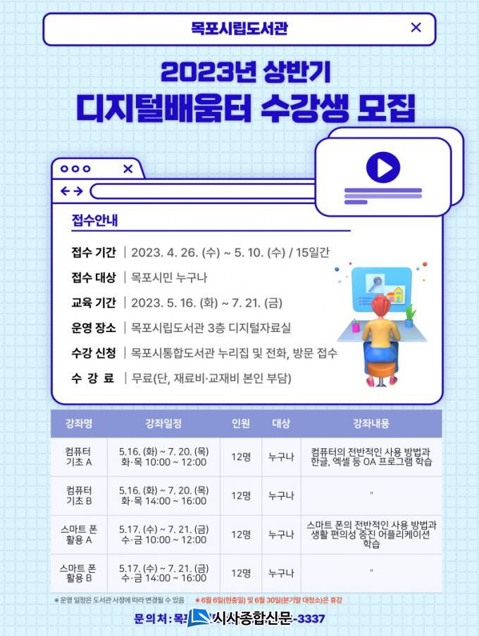 À̹ø °Á´ ÄÄÇ»ÅÍ ±âÃÊ, ½º¸¶Æ® Æù Ȱ¿ë µî 2°³ °Á 4°³ °úÁ¤À» Àü¹® °»ç¿Í ÇÔ²² 5¿ù 16ÀϺÎÅÍ 7¿ù 21ÀϱîÁö ÃÑ 10ÁÖ°£ ¸ñÆ÷½Ã¸³µµ¼°ü 3Ãþ µðÁöÅÐÀÚ·á½Ç¿¡¼ ¿î¿µµÈ´Ù.