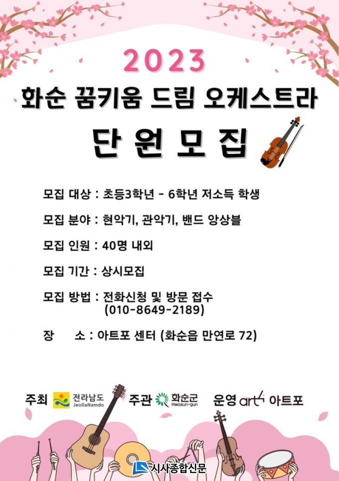 ȼø±º °ø¸ð¸¦ ÅëÇØ ¼±Á¤µÈ ¡®¾ÆÆ®Æ÷ ¼¾ÅÍ¡¯¿¡¼´Â ²ÞŰ¿ò µå¸² ¿ÀÄɽºÆ®¶ó ¿î¿µÀ» À§ÇØ °ü³» °ÅÁÖ Àú¼ÒµæÃþ ¾Æµ¿(Ãʵî 3Çгâ~6Çгâ)À» ´ë»óÀ¸·Î »õ·Î¿î ´Ü¿øÀ» ¿¬Áß ¸ðÁýÇϰí ÀÖ´Ù°í ¹àÇû´Ù. ½ÅûÀº ȼøÀ¾ ¸¸¿¬¸® 72-4, ¾ÆÆ®Æ÷ ¼¾ÅÍ¿¡ Á÷Á¢ ¹æ¹®ÇÏ¿© ½Åû¼¸¦ Á¦ÃâÇÏ¸é µÇ°í ÀÇ»çÇ×Àº ÀüÈ(010-8649-2189)·Î ÇÏ¸é µÈ´Ù.