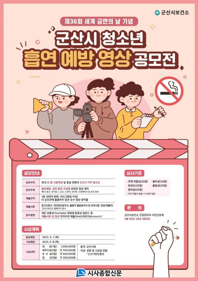 Èñ¸Á Âü°¡ÀÚ´Â ¿À´Â 29ÀϱîÁö ±º»ê½Ã º¸°Ç¼Ò ȨÆäÀÌÁö¸¦ Âü°íÇØ Á¦Ãâ¼·ù ¹× ¿µ»óÀ» ÀüÀÚ¿ìÆí(tkek50857@korea.kr)À¸·Î Á¦ÃâÇÏ¸é µÈ´Ù. ½É»çÀ§¿øÀÇ ½É»ç¸¦ ÅëÇØ ´ë»ó 1¸í(100¸¸¿ø), ÃÖ¿ì¼ö»ó 2¸í(70¸¸¿ø) ¿ì¼ö»ó 3¸í(50¸¸¿ø), ÀÔ¼± 5¸í(20¸¸¿ø) ÃÑ 11¸íÀ» ¼±Á¤ÇØ ±º»ê»ç¶û»óǰ±Ç°ú »óÀåÀ» Áö±ÞÇÒ °èȹÀÌ´Ù. ¼ö»óÀÛÀº 6¿ù Áß º¸°Ç¼Ò ȨÆäÀÌÁö¸¦ ÅëÇØ ¹ßÇ¥ÇÒ ¿¹Á¤ÀÌ´Ù.
