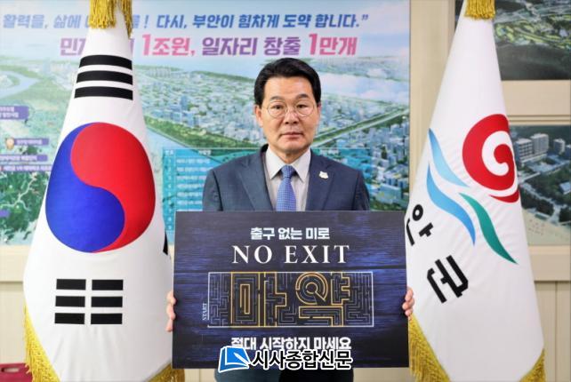 ºÎ¾È±º Á¦1È£ ÁÖÀÚÀÎ ºÎ¾È°æÂû¼ÀåÀ¸·ÎºÎÅÍ Ä·ÆäÀÎ Âü¿©¸¦ Áö¸ñ¹ÞÀº ±ÇÀÍÇö ºÎ¾È±º¼ö´Â ¡®Ãⱸ ¾ø´Â ¹Ì·Î, NO EXIT, ¸¶¾à Àý´ë ½ÃÀÛÇÏÁö ¸¶¼¼¿ä¡¯¶ó´Â ¹®±¸¸¦ ´ãÀº Ä·ÆäÀÎ ÇÇÄϰú ÇÔ²² ÀÎÁõ»çÁøÀ» Âï¾î ¸¶¾à ô°á °ø°¨´ë È®»ê¿¡ Âü¿©Çß´Ù.