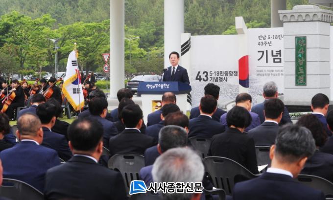 ¡®¿À¿ùÀÇ Á¤½ÅÀ» ¿À´ÃÀÇ Á¤ÀǷΡ¯¸¦ ÁÖÁ¦·Î ¿¸° À̳¯ ±â³ä½Ä¿£ ±è¿µ·Ï Àü³²µµÁö»ç¿Í ±¹È¸ÀÇ¿ø, µµÀÇ¿ø, 5¡¤18 À¯°øÀÚ¿Í À¯Á·, µµ À¯°ü±â°üÀå, »çȸ´Üü µî 300¿© ¸íÀÌ Âü¼®Çß´Ù.