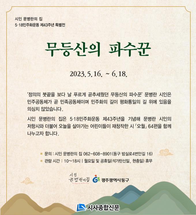 [½Ã»çÁ¾ÇսŹ® = ¿À½ÂÅà ±âÀÚ] ±¤ÁÖ±¤¿ª½Ã µ¿±¸(ûÀå ÀÓÅÃ)´Â Áö»êµ¿¿¡ °³°üÇÑ ½ÃÀÎ ¹®º´¶õÀÇ Áý¿¡¼ Á¦43ÁÖ³â 5¡¤18±¤ÁÖ¹ÎÁÖȿÀ» ±â³äÇÑ Æ¯º° Àü½Ã ¡®¹«µî»êÀÇ ÆÄ¼ö²Û¡¯À» 6¿ù 18ÀϱîÁö ÇÑ ´Þ°£ °³ÃÖÇÑ´Ù°í ¹àÇû´Ù.