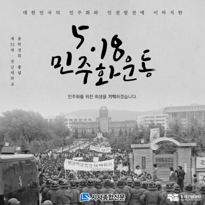Àü³²´ë ÃÑÇлýȸ ¡®Á߽ɡ¯(ȸÀå Á¤À±Áß)Àº 5¿ù 18ÀϺÎÅÍ ¡®1980³â 5¿ù 18ÀÏ ±×³¯ÀÇ ¼þ°íÇÑ Á¤½ÅÀº ¿µ¿øÇÑ ¿ë±â¿Í Èñ¸ÁÀÔ´Ï´Ù.¡¯¶ó´Â ¸Þ½ÃÁö¸¦ ¼Õ±Û¾¾·Î Á÷Á¢ ½á¼ ÀνºÅ¸±×·¥¿¡ ű×ÇÏ´Â ¸±·¹À̸¦ ÆîÄ¡°í ÀÖ´Ù.