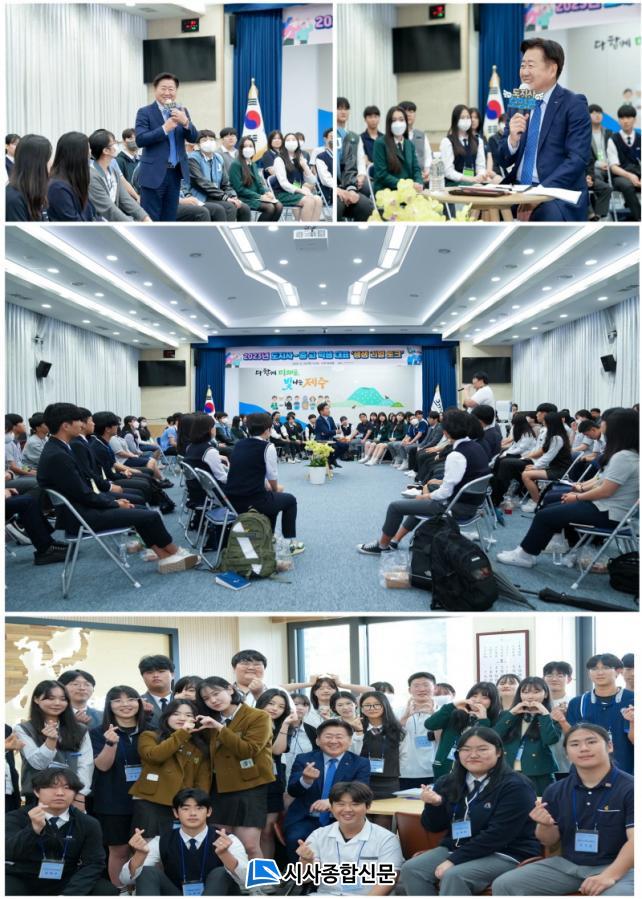 À̳¯ ÇлýµéÀº ´ëÈ¿¡ ¾Õ¼ µµÁö»ç Áý¹«½ÇÀ» °ßÇÐÇÏ°í ¿À¿µÈÆ Áö»ç¿Í ±â³ä»çÁøÀ» Âï¾úÀ¸¸ç, ¡®´ÙÇÔ²² ¹Ì·¡·Î ºû³ª´Â Á¦ÁÖ¡¯ Á¦ÁÖµµ È«º¸¿µ»óÀ» ½ÃûÇß´Ù. À̾îÁø ¡®»ý»ý ¸®¾ó ÅäÅ©¡¯¿¡¼ ¿À¿µÈÆ Áö»ç´Â ÇлýµéÀÇ ¿äûÀ¸·Î ´ëÈÀÇ ÀÚ¸®°¡ ¸¶·ÃµÈ °Í¿¡ ´ëÇØ ¹Ý°¡¿ò°ú ȯ¿µÀÇ Àλ縦 ÀüÇϰí Çлýµé°ú ÁúÀÇÀÀ´äÀ» ÁÖ°í¹Þ¾Ò´Ù.