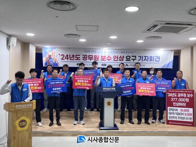 À̳¯ ±âÀÚȸ°ß¿¡¼ °ø¹«¿ø³ëµ¿Á¶ÇÕ Àü³²¿¬¸ÍÀº Á¤ºÎ°¡ Äڷγª19¿Í °í¹°°¡ µîÀÇ ÀÌÀ¯·Î °ø¹«¿ø ³ëµ¿ÀÚ¿¡°Ô ÀϹæÀû Èñ»ýÀ» °¿äÇÑ °ÍÀ» ¹Ý¿µÇØ '21³âºÎÅÍ '23³â±îÁöÀÇ ½ÇÁú¼Òµæ °¨¼ÒºÐ ´©ÀûÄ¡¿Í '24³âµµ ¼ÒºñÀÚ¹°°¡ Àü¸ÁÄ¡¸¦ °í·ÁÇØ ³»³âµµ Àüü °ø¹«¿ø º¸¼ö¸¦ 377,000¿ø Á¤¾×À¸·Î ÀλóÇÒ °Í°ú Á¤¾×±Þ½Äºñ¿Í 6±Þ ÀÌÇÏ Á÷±Þº¸Á¶ºñ¸¦ °¢°¢ 80,000¿ø‧35,000¿ø¾¿ ÀλóÇϰí, Ãʰú±Ù¹«¼ö´ç°ú ¿¬°¡º¸»óºñÀÇ »êÁ¤ ¹æ½ÄÀ» ¹Î°£¼öÁØÀ¸·Î °³Á¤ÇØ ÇÏÀ§Á÷ °ø¹«¿ø ³ëµ¿ÀÚÀÇ Ã³¿ì°³¼±À» À§ÇÑ ½ÇÁúÀûÀÎ Á¤Ã¥Àû Áö¿ø¿¡ ³ª¼³ °ÍÀ» Á¤ºÎ¿¡ ¿ä±¸Çß´Ù.