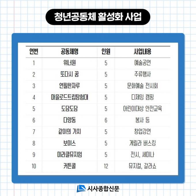 ÇöÀç û³â °øµ¿Ã¼ Áö¿ø»ç¾÷Àº û³â Ä¿¹Â´ÏƼ Áö¿ø»ç¾÷, û³âµµÀü Áö¿ø»ç¾÷, û³â °øµ¿Ã¼ Ȱ¼ºÈ »ç¾÷ µî 3°³ »ç¾÷À¸·Î ÃÑ 25°³ ÆÀÀÌ ¼±Á¤µÇ¾î Ȱµ¿ ÁßÀÌ´Ù. ÀÌ »ç¾÷À» ÅëÇØ ¼øÃµ û³âµéÀÌ °³ÀÎÀº ¹°·Ð °øµ¿Ã¼ ¿ª·®À» °ÈÇϰí Á¤¿ø¹Ú¶÷ȸ µî°ú °ü·ÃÇÑ Áö¿ª»çȸ Ȱµ¿ ÁÖü·Î µµ¾àÇϰí ÀÖ´Ù.