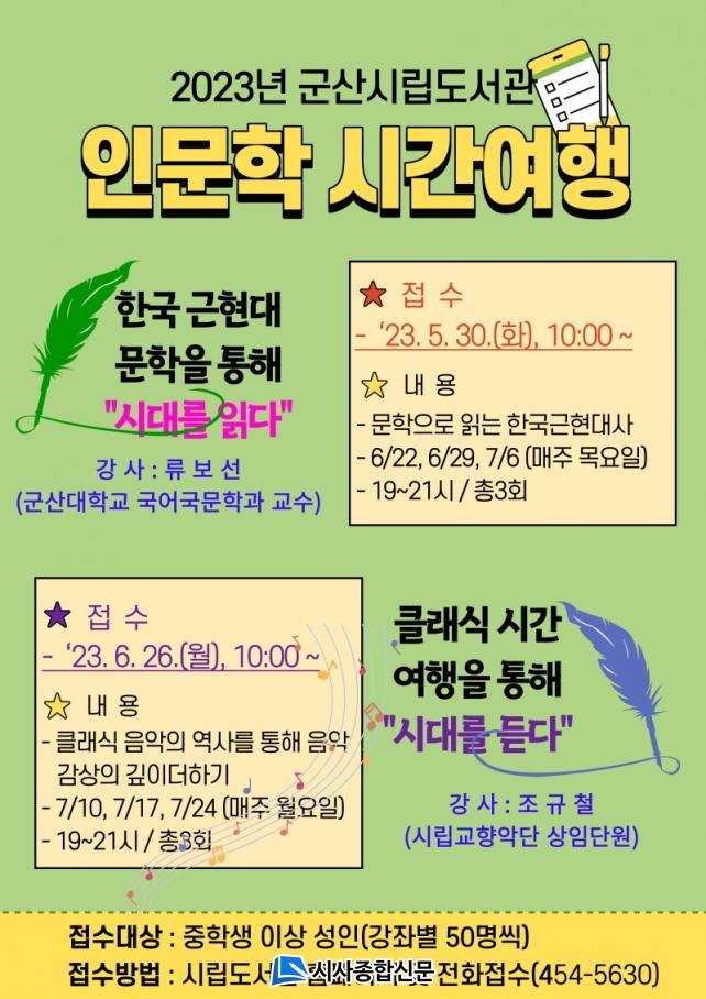 °Áº° 3ȸ¾¿, ÃÑ 6ȸ·Î ÀÌ·ïÁö´Â À̹ø °ÀÇ´Â, ¿À´Â 6¿ù 22ÀϺÎÅÍ 7¿ù 6ÀϱîÁö ¸ÅÁÖ ¸ñ¿äÀÏ ¿ÀÈÄ 7½Ã, ±º»ê´ëÇб³ ±¹¾î±¹¹®Çаú ·ùº¸¼± ±³¼ö´Ô¿Í ¡®Çѱ¹ ±ÙÇö´ë ¹®ÇÐÀ» ÅëÇØ ½Ã´ë¸¦ Àд١¯¶ó´Â ÁÖÁ¦ÀÇ ¹®ÇаÁ¸¦ ½Ç½ÃÇÑ´Ù. 7¿ù 10ÀϺÎÅÍ 24ÀϱîÁö ¸ÅÁÖ ¿ù¿äÀÏ ¿ÀÈÄ 7½Ã, ±³Çâ¾Ç´Ü »óÀÓ´Ü¿øÀÎ Á¶±Ôö ¼±»ý´ÔÀÇ¡®Å¬·¡½Ä ½Ã°£¿©ÇàÀ» ÅëÇØ ½Ã´ë¸¦ µè´Ù¡¯¶ó´Â ÁÖÁ¦ÀÇ À½¾Ç°Áµµ ¿î¿µµÈ´Ù.