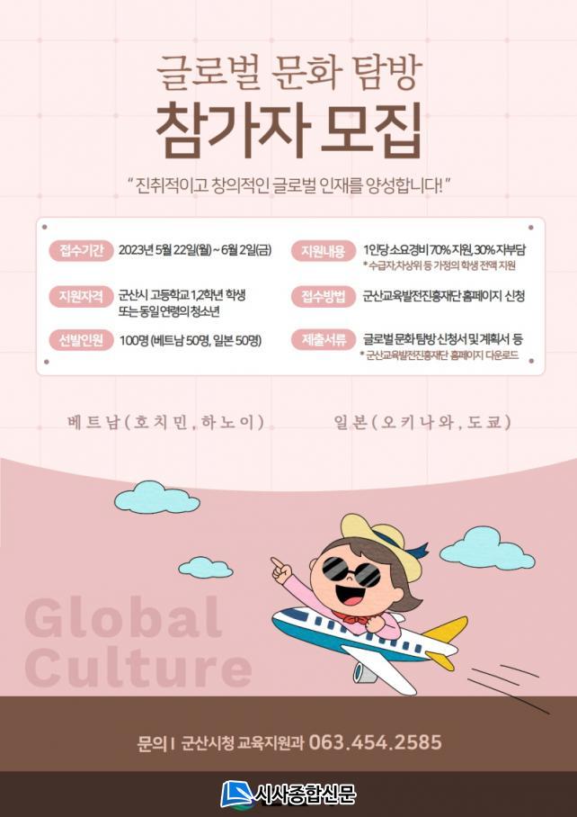 ÇÑÆí, ±Û·Î¹ú ¹®È޹æÀº ¿À´Â 6¿ù 2ÀϱîÁö ±º»ê½Ã±³À°¹ßÀüÁøÈïÀç´Ü ȨÆäÀÌÁö¸¦ ÅëÇØ ½ÅûÀÌ °¡´ÉÇϸç, ÀÚ¼¼ÇÑ »çÇ×Àº Àç´Ü ȨÆäÀÌÁö °ø°í¹®À» È®ÀÎÇϰųª ½Ã ±³À°Áö¿ø°ú(454-2585)·Î ¹®ÀÇÇÏ¸é µÈ´Ù.