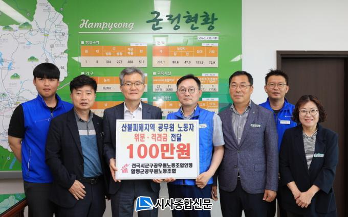 26ÀÏ ÇÔÆò±º¿¡ µû¸£¸é °ø¹«¿ø³ëµ¿Á¶ÇÕ¿¬¸ÍÀÌ À̳¯ ¿ÀÀü Áö³´Þ ¹ß»ýÇÑ »êºÒ ÁøÈ ÀÛ¾÷¿¡ Âü¿©ÇÑ ÇÔÆò±º °ø¹«¿øÀ» °Ý·ÁÇϱâ À§ÇØ 100¸¸¿øÀ» Àü´ÞÇß´Ù.