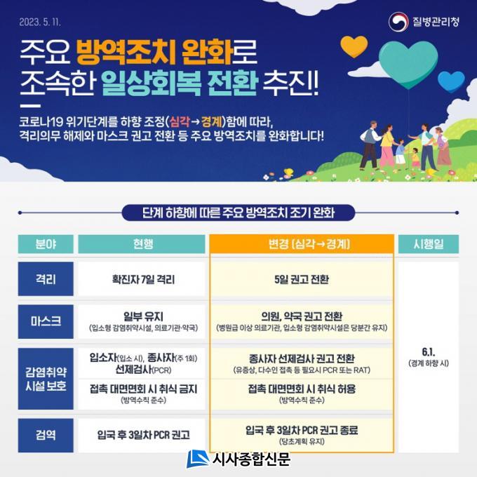 ¹æ¿ª Á¤Ã¥ ¿ÏÈ »çÇ×À¸·Î´Â ¡âÈ®ÁøÀÚ 7ÀÏ Àǹ« °Ý¸®¿¡¼ 5ÀÏ °Ý¸® ±Ç°í(ÀÔ¿ø ȯÀÚ, °¨¿°Ãë¾à½Ã¼³ ÀÔ¼ÒÀÚ´Â 7ÀÏ) ¡âÀÇ¿ø¡¤¾à±¹ µî ½Ç³» ¸¶½ºÅ© Àü¸é ±Ç°í Àüȯ(º´¿ø±Þ ÀÇ·á±â°ü, °¨¿° Ãë¾à ½Ã¼³ Âø¿ë Àǹ« À¯Áö) ¡âÀÔ±¹ ÈÄ 3ÀÏ Â÷ PCR°Ë»ç ±Ç°í Á¾·á ¡â°¨¿°Ãë¾à½Ã¼³ ¸éȸ ½Ã Ãë½Ä Çã¿ë ¹× Á¾»çÀÚ ¼±Á¦ °Ë»ç ±Ç°í Àüȯ µîÀÌ´Ù.