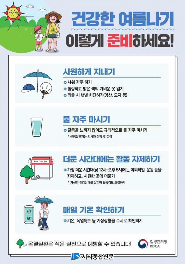 ÇÑÆí, ÀüÁֽú¸°Ç¼Ò °ü°èÀÚ´Â ¡°¿Ã¿©¸§Àº Æò³âº¸´Ù ¹«´õ¿î ³¯¾¾¸¦ º¸ÀÏ ¶§°¡ ¸¹À» °ÍÀ̶ó´Â ±â»óûÀÇ ±âÈÄ Àü¸ÁÀÌ ÀÖ´Â ¸¸Å, ¿Â¿Áúȯ¿¡ Ãë¾àÇÑ ¸¸¼ºÁúȯÀÚ´Â Æø¿°´ëºñ °Ç°¼öÄ¢ 3°¡ÁöÀÎ ½Ã¿øÇÏ°Ô Áö³»±â, ¹° ÀÚÁÖ ¸¶½Ã±â, ´õ¿î ½Ã°£´ë¿¡´Â ¾ß¿Ü Ȱµ¿ ÀÚÁ¦Çϱ⸦ ²À ÁؼöÇØ ´Þ¶ó¡±°í ´çºÎÇß´Ù.