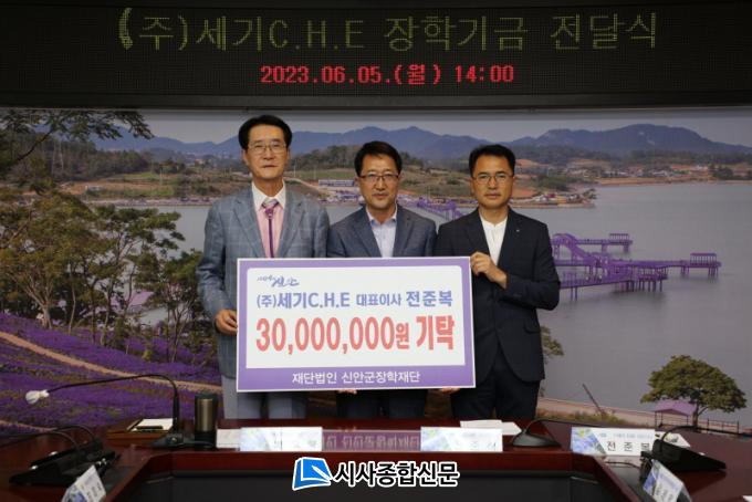[½Ã»çÁ¾ÇսŹ® = ¿À½ÂÅà ±âÀÚ] ¢ß¼¼±âC.H.E ÀüÁغ¹ ´ëÇ¥¿Í ÀüÁؼ® CEO´Â 5ÀÏ ½Å¾È±ºÀåÇÐÀç´Ü(ÀÌ»çÀå ¹Ú¿ì·®)¿¡ Áö¿ª»çȸÀÇ ¾î·Á¿î ÇлýµéÀ» À§ÇØ »ç¿ëÇØ ´Þ¶ó¸ç ÀåÇбâ±Ý 3õ¸¸ ¿øÀ» Àü´ÞÇß´Ù.