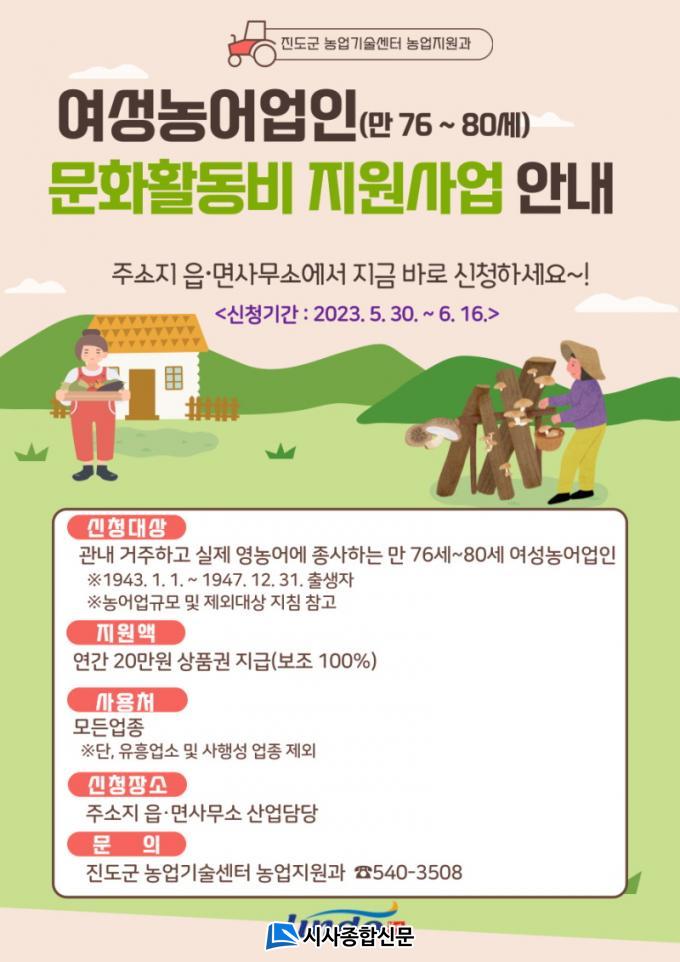 ƯÈ÷ Áøµµ±ºÀº °æÁ¦Àû Â÷º°°ú ¹®ÈÀû °ÝÂ÷¸¦ ÇØ¼ÒÇϱâ À§ÇØ ¸¸ 76¼¼~80¼¼ÀÇ ¿©¼º ³ó¾î¾÷Àε鿡°Ôµµ Ãß°¡·Î Áö¿øÀ» ½Ç½ÃÇÑ´Ù. ´ë»óÀÚ°¡ ¿À´Â 16ÀÏ(±Ý)±îÁö °ÅÁÖÁö À¾¡¤¸é»ç¹«¼Ò¿¡¼ ½ÅûÇÏ¸é ³óÇù±ºÁöºÎ¿Í Áö¿ª³óÇù µî¿¡¼ Áøµµ¾Æ¸®¶û»óǰ±ÇÀ¸·Î Áö±ÞÇÒ ¿¹Á¤ÀÌ´Ù.