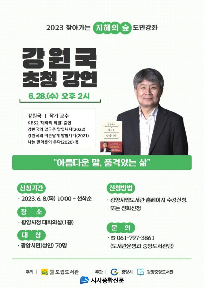 À̹ø °¿¬Àº ±¤¾ç½Ãû ´ëȸÀǽǿ¡¼ ±¤¾ç½Ã¹Î°ú ½Ãû Á÷¿øÀÌ ÇÔ²² Áñ±â´Â Àι®ÇÐ °¿¬À¸·Î Á¦°øµÉ ¿¹Á¤À̸ç, ¡®°¿ø±¹ÀÇ ¾î¸¥´ä°Ô ¸»ÇÕ´Ï´Ù¡¯, ¡®³ª´Â ¸»ÇϵíÀÌ ¾´´Ù¡¯, ¡®´ëÅë·ÉÀÇ ±Û¾²±â¡¯ µî ´Ù¼öÀÇ º£½ºÆ®¼¿·¯¸¦ ÁýÇÊÇÑ °¿ø±¹ ÀÛ°¡°¡ ¡®¾Æ¸§´Ù¿î ¸», ǰ°ÝÀÖ´Â »î¡¯À» ÁÖÁ¦·Î À̾߱⸦ ÆîÄ£´Ù.