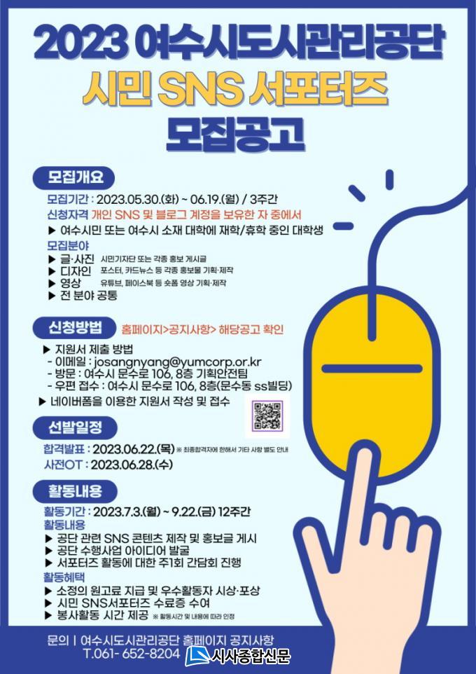 ½Ã¹Î SNS ¼Æ÷ÅÍÁî¿¡ ´ëÇÑ Á¤º¸´Â °ø´Ü ȨÆäÀÌÁö ¾Ë¸²¸¶´çÀÇ °øÁö»çÇ×(https://www.yumcorp.or.kr)À» ÅëÇØ È®ÀÎÇÒ ¼ö ÀÖ´Ù. ÀÚ¼¼ÇÑ »çÇ×Àº ¿©¼ö½Ãµµ½Ã°ü¸®°ø´Ü ±âȹ¾ÈÀüÆÀ(061-652-8204)À¸·Î ¹®ÀÇÇÏ¸é µÈ´Ù.