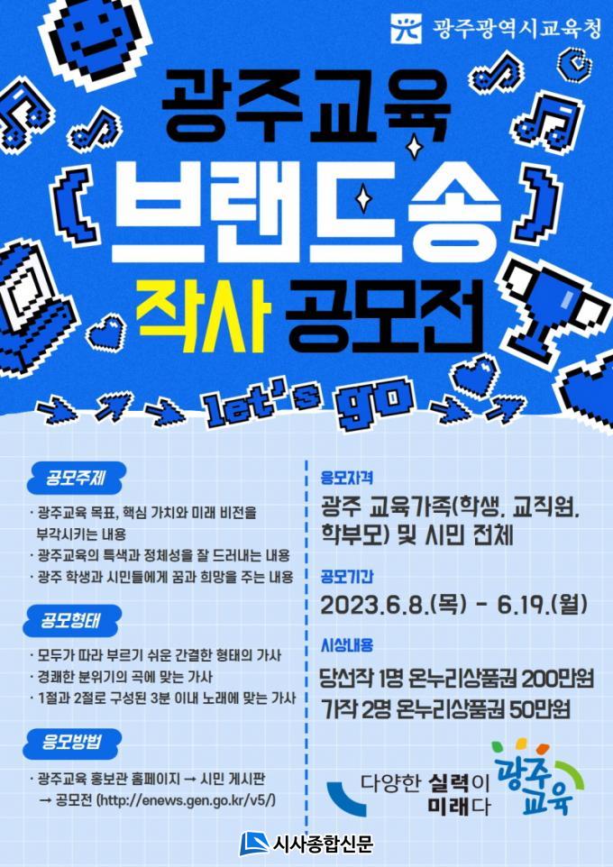 ºê·£µå ¼ÛÀÇ °æ¿ì ±¤ÁÖ ±³À°°¡Á·(Çлý¡¤±³Á÷¿ø¡¤Çкθð) ¹× ½Ã¹Î ´ë»óÀ¸·Î °¡»ç °ø¸ð¸¦ ÁøÇàÇÑ´Ù. ÁÖÁ¦´Â ±¤ÁÖ±³À°ÀÇ Á¤Ã¼¼º°ú ¹Ì·¡ ºñÀü, ±¤ÁÖ Çлýµé¿¡°Ô ²Þ°ú Èñ¸ÁÀ» ÁÖ´Â ³»¿ëÀ¸·Î ¼³Á¤Çß´Ù. °ø¸ð ±â°£Àº 8~19ÀÏÀ̸ç, ÃÖÁ¾ ´ç¼±ÀÛ 1¸í, °¡ÀÛ 2¸íÀ» ¼±Á¤ÇÑ´Ù. ´ç¼±ÀÛÀ» ¹ÙÅÁÀ¸·Î Àü¹®°¡¿¡°Ô ÀÛ°îÀ» ÀÇ·ÚÇÏ°í °ËÅä ¹× È®Á¤À» ¸¶Ä£ ÈÄ È°¿ëÀ» ¾È³»ÇÒ °èȹÀÌ´Ù.
