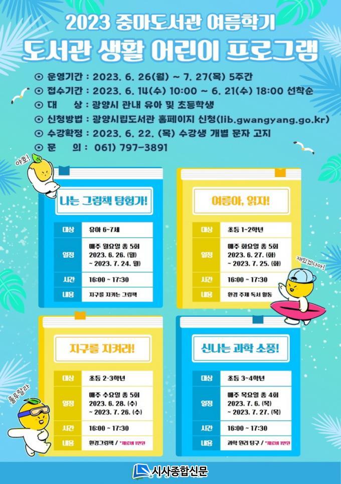 [½Ã»çÁ¾ÇսŹ® = Àå¹Î±Ô ±âÀÚ] ±¤¾ç½Ã Á߸¶µµ¼°üÀº ¿©¸§Çб⸦ ¸Â¾Æ ¿À´Â 26ÀϺÎÅÍ 7¿ù 27ÀϱîÁö 5ÁÖ µ¿¾È ¾î¸°ÀÌ(À¯¾Æ 6~7¼¼)¿Í ÃʵîÇлý(1-4Çгâ)À» ´ë»óÀ¸·Î µµ¼°ü »ýȰ ¾î¸°ÀÌ ÇÁ·Î±×·¥À» ¿î¿µÇÑ´Ù.