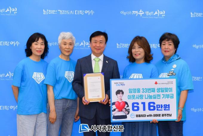 8ÀÏ ¿©¼ö½Ã¿¡ µû¸£¸é ¿ÀÀü ½ÃÀå½Ç¿¡¼ ¿¸° Àü´Þ½Ä¿¡´Â Á¤±â¸í ¿©¼ö½ÃÀå°ú ¡®¿µ¿õ½Ã´ë with Hero ±¤ÁÖ¡¤Àü³²¡¯ ȸ¿øµéÀÌ Âü¼®Çß´Ù. Àü´ÞµÈ ±âʱÝÀº °¡¼ö ÀÓ¿µ¿õÀÇ 33¹øÂ° »ýÀÏÀÎ 6¿ù 16ÀÏÀ» ±â³äÇÑ 616¸¸ ¿øÀ¸·Î, ¡®¿µ¿õ½Ã´ë with Hero ±¤ÁÖ¡¤Àü³²¡¯ ȸ¿øµéÀÌ ½Ê½ÃÀÏ¹Ý ¸ð±ÝÀ¸·Î ¸¶·ÃµÆ´Ù.
