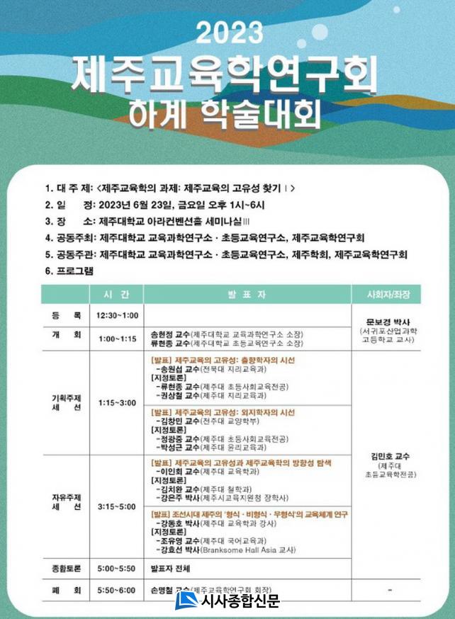 À̹ø Çмú´ëȸÀÇ ÁÖÁ¦´Â ¡®Á¦ÁÖ±³À°ÇÐÀÇ °úÁ¦: Á¦ÁÖ±³À°ÀÇ °íÀ¯¼º ã±â¥°¡¯ÀÌ´Ù. ±âȹÁÖÁ¦¿Í ÀÚÀ¯ÁÖÁ¦ ¼¼¼ÇÀ¸·Î ±¸¼ºµÈ´Ù. ¹ßÇ¥´Â ÀüºÏ´ë ¼Û¿ø¼· ±³¼ö, ÀüÁÖ´ë ±èâ¹Î ±³¼ö, Á¦ÁÖ´ë ÀÌÀÎȸ ±³¼ö, Á¦ÁÖ´ë °µ¿È£ ¹Ú»ç°¡ ÇÑ´Ù.