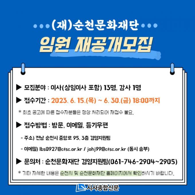 | Àç´Ü¹ýÀÎ ¼øÃµ¹®ÈÀç´Ü, Á¦3±â ÀÓ¿ø Àç°ø°³ ¸ðÁý ÀÌ»ç 13¸í, °¨»ç 1¸í ¸ðÁý, À̹ø´Þ 30ÀϱîÁö Á¢¼ö |