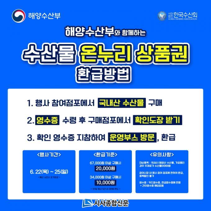 Çà»ç´Â ¿À´Â 22ÀϺÎÅÍ 25ÀϱîÁö ÁøÇàµÇ¸ç, ¼ö»ê¹° ÆÇ¸ÅÁ¡Æ÷¿¡¼ ±¹³»»ê ¼ö»ê¹°À» ±¸ÀÔÇÏ¸é ½ÃÀå ³» ȯ±Þ ºÎ½º¿¡¼ ¿µ¼öÁõÀ» È®ÀÎÇÏ°í ´çÀÏ ±¸¸Å±Ý¾×ÀÇ ÃÖ´ë 30%¸¦(ÃÖ´ë 2¸¸¿ø) ¿Â´©¸®»óǰ±ÇÀ¸·Î ȯ±ÞÇØÁÖ´Â ¹æ½ÄÀ¸·Î ÁøÇàµÈ´Ù.
