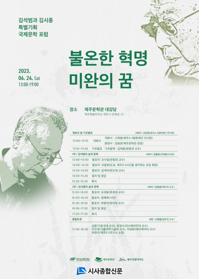 Á¦ÁÖ4.3ÆòÈÀç´Ü(ÀÌ»çÀå °íÈñ¹ü)°ú Á¦ÁÖ¹®Çаü(°üÀå °¿ëÁØ)Àº ¿À´Â 6¿ù 24ÀÏ(Åä) Á¦ÁÖ¹®Çаü ´ë°´ç¿¡¼ ¡®±è¼®¹ü°ú ±è½ÃÁ¾ Ưº°±âȹ ±¹Á¦¹®ÇÐ Æ÷·³¡¯¸¦ °³ÃÖÇÑ´Ù.