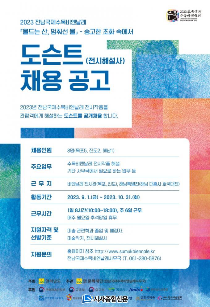 ÇÑÆí, °ü·Ã ½Åû¼·ù´Â Àü³²±¹Á¦¼ö¹¬ºñ¿£³¯·¹(www.sumukbiennale.kr)¿Í Àü³²¹®ÈÀç´Ü(www.jncf.or.kr) °øÁö»çÇ׿¡¼ È®ÀÎÇÒ ¼ö ÀÖ´Ù. ÀÚ¼¼ÇÑ »çÇ×Àº Àü³²±¹Á¦¼ö¹¬ºñ¿£³¯·¹ »ç¹«±¹ Çà»ç¿î¿µÆÀ(061-286-5876)À¸·Î ¹®ÀÇÇÏ¸é µÈ´Ù.