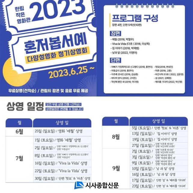 ÃÑ18ȸ¿¡ °ÉÄ£ À̹ø Á¤±â»ó¿µÀº ¹«·á·Î ÁøÇàµÇ¸ç, Á¼®Àº ´çÀÏ ¼±Âø¼øÀ¸·Î ¹èºÎµÈ´Ù. ÀÚ¼¼ÇÑ »ó¿µÀÏÁ¤°ú Á¤º¸´Â ÇѸ²ÀÛÀº¿µÈ°ü īī¿ÀÅåä³Î ¶Ç´Â ÀνºÅ¸±×·¥(instagram.com/hallimcinema)¿¡¼ È®ÀÎÇÒ ¼ö ÀÖ´Ù.