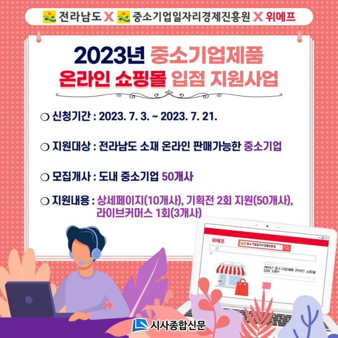 ¿Â¶óÀÎ ÆÇ¸Å °¡´ÉÇÑ Àü³²Áö¿ª Áß¼Ò±â¾÷ 50°³ »ç¸¦ ¼±Á¤ÇØ ¢ßÀ§¸ÞÇÁ ÀÔÁ¡À» Áö¿øÇÑ´Ù. ½Åû ±â°£Àº ¿À´Â 21ÀϱîÁö·Î Çʿ伷ù¸¦ ÁغñÇØ Àü³²Áß¼Ò±â¾÷ÀÏÀÚ¸®°æÁ¦ÁøÈï¿øÀ¸·Î ÀüÀÚ¿ìÆí(ksg8603@jepa.kr)À» ÀÌ¿ëÇØ Á¦ÃâÇÏ¸é µÈ´Ù.
