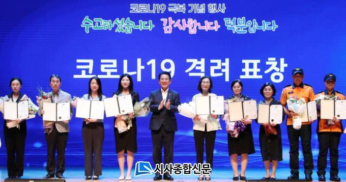 À¯°øÀÚ ½Ã»ó½Ä°ú Äڷγª19 ±Øº¹¿µ»ó, ÇåÁ¤°ø¿¬ µîÀ¸·Î ÁøÇàµÈ Çà»ç¿¡¼± Áö³ 6¿ù 1ÀÏ ÀÚ·Î Äڷγª19 À§±â ´Ü°è°¡ ¡®½É°¢¡¯¿¡¼ ¡®°æ°è¡¯ ´Ü°è·Î ÇÏÇâ Á¶Á¤µÊ¿¡ µû¶ó 3³â 6°³¿ù¿© ±â°£ ÃÖÀϼ±¿¡¼ Çå½ÅÇÑ µµ¹Î, ÀÇ·áÁø, °øÁ÷ÀÚ µî 120¿© ¸í¿¡°Ô ǥâÀ» Àü´ÞÇØ ±×µ¿¾ÈÀÇ ³ë°í¸¦ °Ý·ÁÇÏ°í °¨»çÀÇ ¸¶À½À» ÀüÇß´Ù.