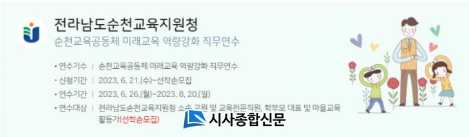 [½Ã»çÁ¾ÇսŹ® = ¿À½ÂÅà ±âÀÚ] ¼øÃµ±³À°Áö¿øÃ»(±³À°Àå ÀÓÁ¾À±)Àº 2023³â 6¿ù 26ÀÏ(¿ù) ~ 8¿ù 20ÀÏ(ÀÏ)±îÁö 8ÁÖ°£ ¼øÃµ±³À°°øµ¿Ã¼(±³¿ø, Çкθð, ¸¶À»±³À°È°µ¿°¡ µî)¸¦ ´ë»óÀ¸·Î ¹Ì·¡±³À° ¿ª·®°È¸¦ À§ÇÑ ¿Â¶óÀÎ ¿¬¼ö¸¦ ¿î¿µ ÁßÀ̸ç 400¿©¸íÀÌ ½ÅûÇÏ¿© ¼øÃµ±³À°°øµ¿Ã¼°¡ ¼øÃµÀÇ ¹Ì·¡±³À°¿¡ ÇÔ²² ³ª¼¹´Ù.