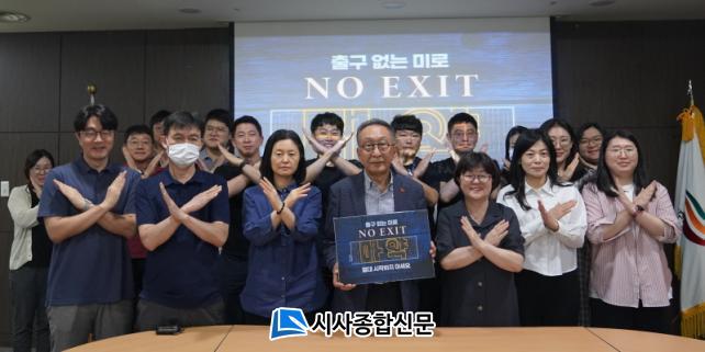 [½Ã»çÁ¾ÇսŹ® = °í¼º¹Î ±âÀÚ] Á¦ÁÖ4¡¤3ÆòÈÀç´Ü(ÀÌ»çÀå °íÈñ¹ü) ÀÓÁ÷¿øµéÀÌ ¸¶¾à ¹üÁË ±ÙÀý ¡® NO EXITÄ·ÆäÀο¡ µ¿ÂüÇß´Ù. ¸¶¾à ±ÙÀý ÀÎ½Ä È®»êÀ» À§ÇØ ¡®Ãⱸ ¾ø´Â ¹Ì·Î¡¯, ¡®¸¶¾à, Àý´ë½ÃÀÛÇÏÁö ¸¶¼¼¿ä¡¯¶ó´Â ¸Þ½ÃÁö¸¦ ÀüÇß´Ù.