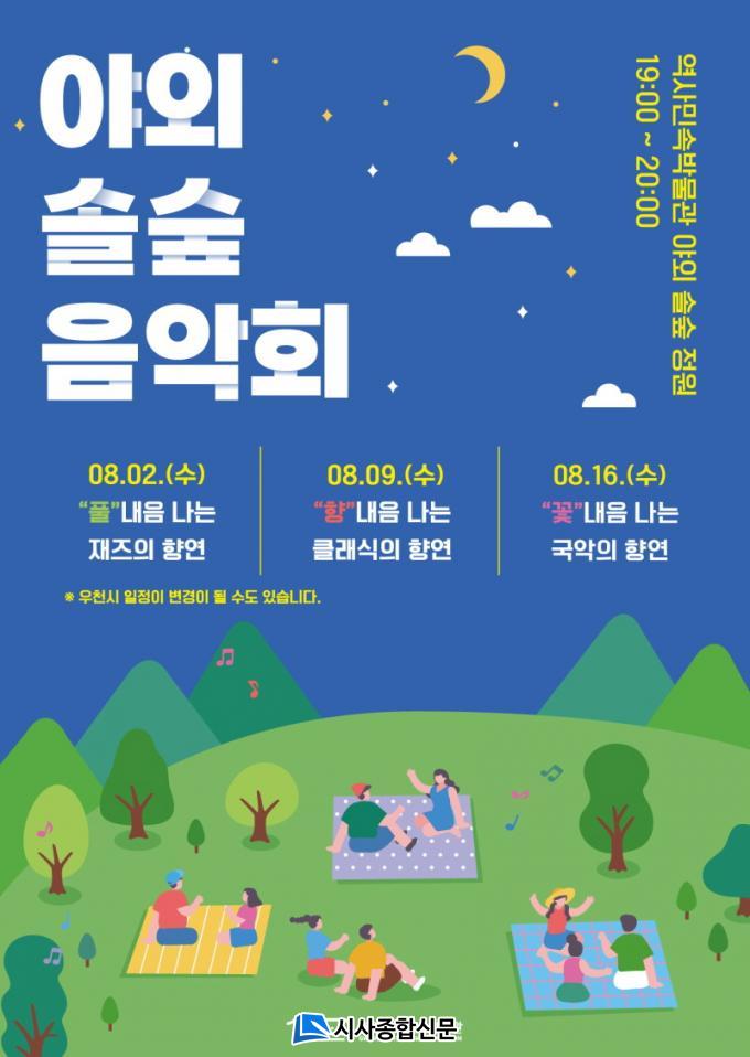 ¸ÕÀú ¡®¼Ö½£À½¾Çȸ¡¯°¡ ¿ª»ç¹Î¼Ó¹Ú¹°°ü ¾ß¿Ü±¤Àå¿¡¼ ÃÑ 3Â÷·Ê ¹«·á·Î ÁøÇàµÈ´Ù. °ø¿¬ ½Ã°£Àº 8¿ù 2ÀÏ, 9ÀÏ, 16ÀÏ Àú³á 7½ÃºÎÅÍ 8½Ã±îÁö´Ù.