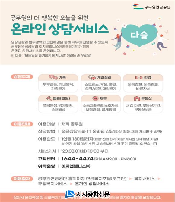¡°´Ù½½¡± ¼ºñ½º´Â ÀçÁ÷ °ø¹«¿øÀÌ¸é ´©±¸³ª ÀÌ¿ëÇÒ ¼ö ÀÖÀ¸¸ç, °ø¹«¿ø¿¬±Ý°ø´Ü ȨÆäÀÌÁö(www.geps.or.kr) ³» ¿¬±Ýº¹ÁöÆ÷ÅÐ – º¹Áö¼ºñ½º - °ø¹«¿ø ¿Â¶óÀÎ »ó´ã¼ºñ½º¿¡¼ °¡´ÉÇÏ´Ù.