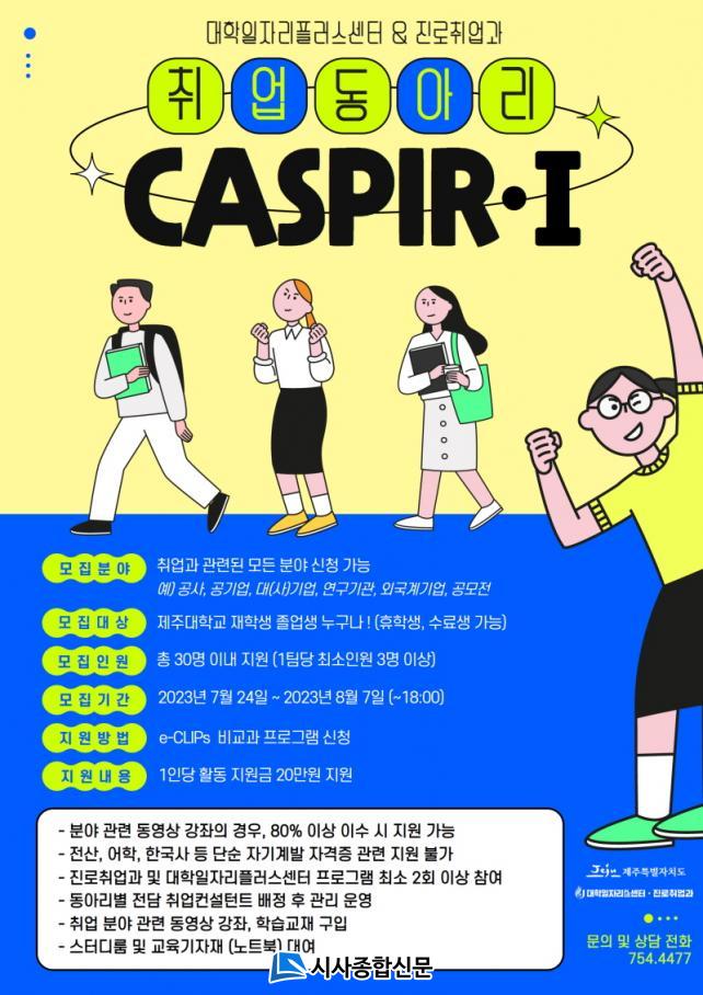 Ãë¾÷µ¿¾Æ¸®(CASPIR-¥°)´Â ÃÖÁ¾ ¼±¹ßÀ» °ÅÃÄ 8¿ùºÎÅÍ 11¿ù±îÁö ¿î¿µµÇ¸ç Ãë¾÷µ¿¾Æ¸® Âü¿© Èñ¸ÁÀÚ´Â Á¦ÁÖ´ëÇб³ Áø·Î¡¤Ãë¾÷ Áö¿ø Æ÷ÅнýºÅÛ(https://clip.jejunu.ac.kr/) ºñ±³°ú ÇÁ·Î±×·¥À» ÅëÇØ ½ÅûÇÒ ¼ö ÀÖ´Ù.
