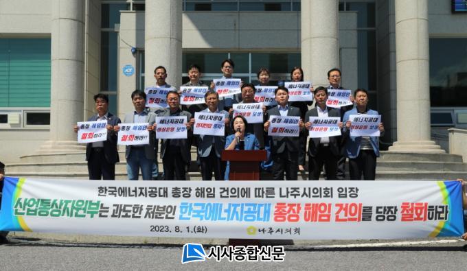 8¿ù 1ÀÏ ³ªÁÖ½ÃÀÇȸ û»ç ¾Õ¿¡¼ »ê¾÷ºÎ¿¡ À±ÀÇÁØ ÃÑÀå ÇØÀÓ °ÇÀǸ¦ Áï°¢ öȸ ¹× Á¤Ä¡Åº¾Ð Áß´Ü ¿ä±¸ ¼º¸í¼¸¦ ¹ßÇ¥Çϸç, ³ªÁÖ½ÃÀÇȸ ÀÇ¿ø 16¸íÀÇ ¿¬´ë ¼¸íÀ» ÅëÇØ ¶æÀ» °°ÀÌÇß´Ù.