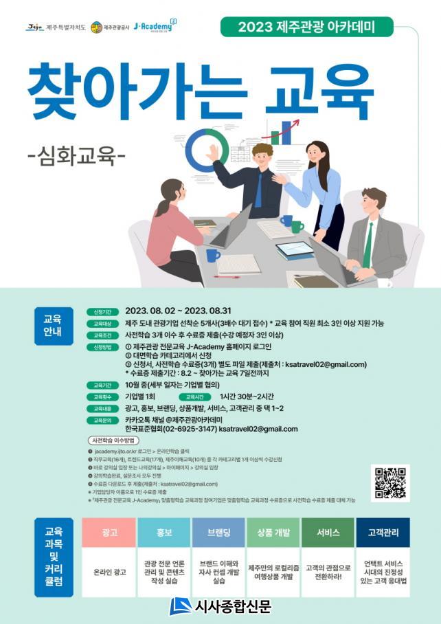 ±³À° ´ë»óÀº Á¦ÁÖ µµ³» °ü±¤±â¾÷ 5°³»ç´Ù. ±³À° Âü¿© ÀοøÀº ÃÖ¼Ò 3ÀÎ ÀÌ»ó °¡´ÉÇϸç, ±³À° ½Ã°£Àº 2½Ã°£, ºñ¿ëÀº ¹«·á´Ù.