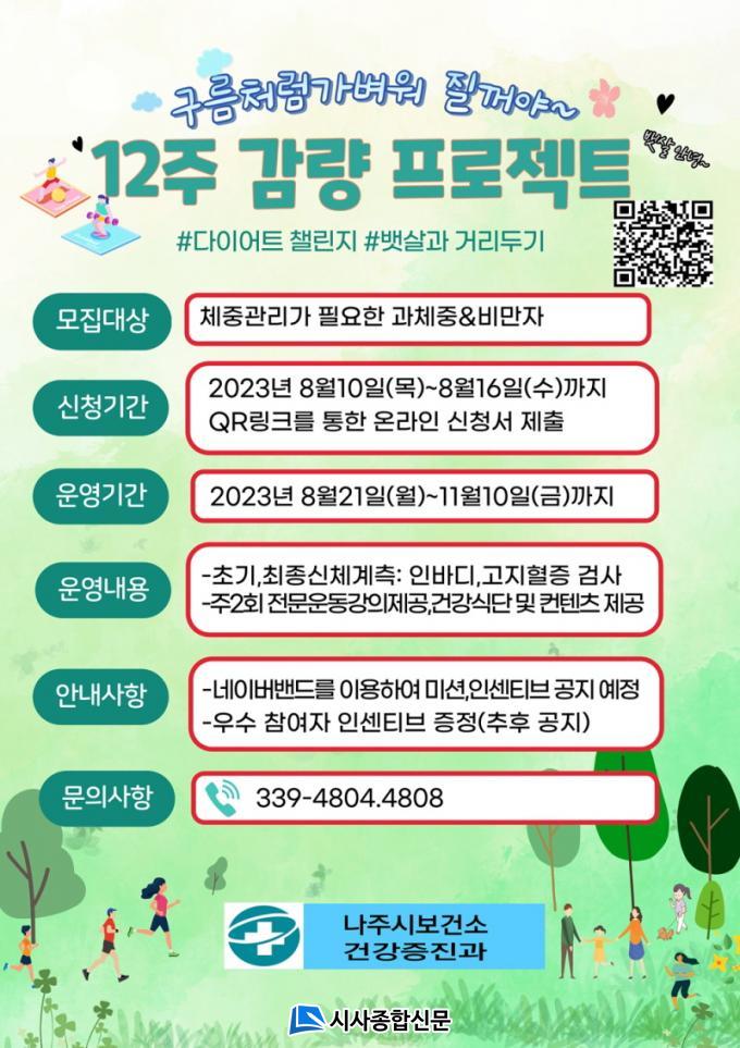 | ³ªÁֽà º¸°Ç¼Ò´Â ¡®ºñ´ë¸é üÁß°¨·® 12ÁÖ ÇÁ·ÎÁ§Æ®¡¯ Âü°¡ÀÚ¸¦ ¸ðÁýÇÑ´Ù. ½ÅûÀº Æ÷½ºÅÍ »ó´Ü QRÄÚµå·Î Á¢¼ÓÇØ ÇÏ¸é µÈ´Ù.