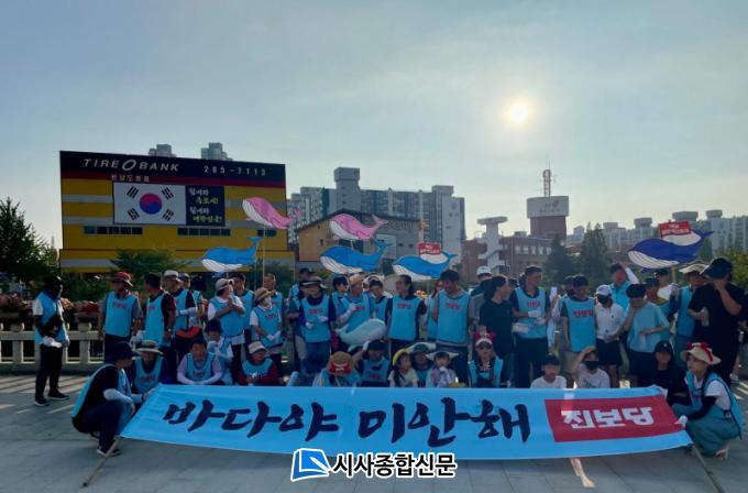 Ä·ÆäÀο¡ Âü¿©ÇÑ Áøº¸´ç 60¿©¸íÀÇ ´ç¿øµéÀº µµÃ»ÀÔ±¸ »ç°Å¸®¿Í ¹é³â´ë·Î¿¡ ÁÙÁö¾î¡®¹Ù´Ù¾ß ¹Ì¾ÈÇØ¡¯, ¡®À±ÅðÁø ¿øÇÏ´Â ¹Ù´Ù¡¯µîÀÇ Çö¼ö¸·°ú °í·¡¸ð¾çÀÇ ÇÇÄÏÀ» µé°í Áö³ª°¡´Â Â÷·®°ú ½Ã¹Îµé¿¡°Ô ¼ÕÀ» Èçµé°í ÀλçÇϸç ÈÄÄí½Ã¸¶ ÇÙ¿À¿°¼ö ÇØ¾çÅõ±â ¹Ý´ëÀÇ ¸ñ¼Ò¸®¸¦ ³ô¿´´Ù.