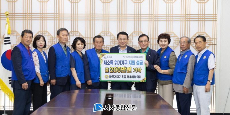 | ¹Ù¸£°Ô»ì±â¿îµ¿ °æÁÖ½ÃÇùÀÇȸ, ÀÍ»ê½Ã¿¡ ÀÌ¿ôµ½±â ¼º±Ý ±âŹ Àú¼Òµæ À§±â°¡±¸¿¡ 200¸¸¿ø ¼º±Ý Àü´Þ |